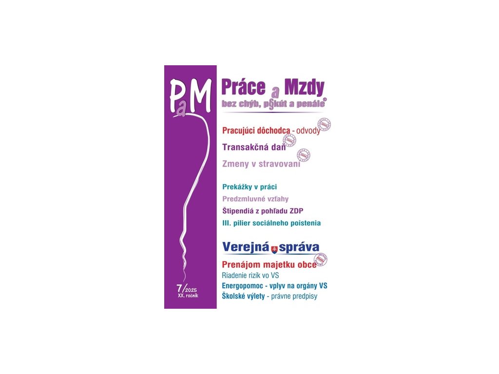 Od 1. apríla 2025 bolo na Slovensku zavedené nové zdanenie finančných transakcií, pri ktorých dochádza k odpísaniu sumy finančných prostriedkov z účtu daňovníka. Od apríla 2025 sa zvýšili sumy stravného v zmysle zákona o cestovných náhradách na 8,80 eur pre časové pásmo 5 až 12 hodín, na 13,10 eur pre časové pásmo 12 až 18 hodín a na 19,50 eur pre časové pásmo nad 18 hodín. Poberatelia dôchodkových dávok, ktorí vykonávajú zárobkovú činnosť, a zároveň sú poberateľmi starobného dôchodku, majú v zdravotnom a sociálnom poistení osobitné postavenie. Kedy môže dôchodca pracovať a aké sú obmedzenia?Doplňkové parametry